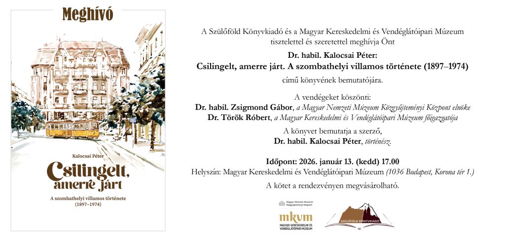 A Magyar Nemzeti Múzeum Közgyűjteményi Központ Magyar Kereskedelmi és Vendéglátóipari Múzeum tisztelettel meghívja Dr. habil. Kalocsai Péter: Csilingelt, amerre járt. A szombathelyi villamos története (1897-1974) című könyvének bemutatójára 2026. január 13-án, kedden 17:00 órától.