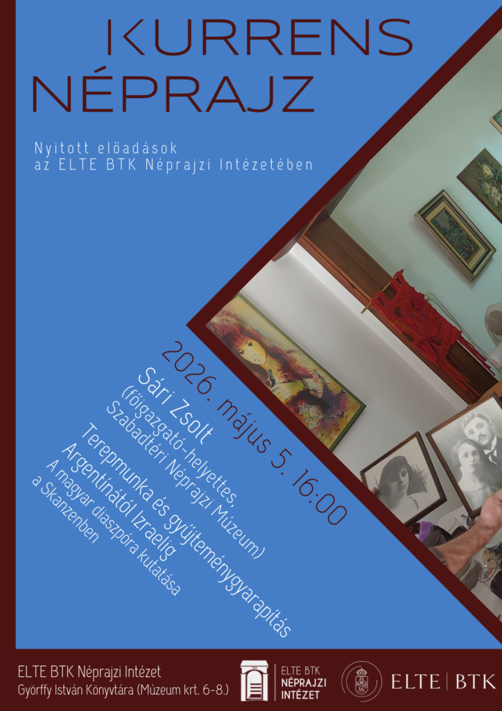 Folytatódik az ELTE BTK Néprajzi Intézetének nyitott előadás-sorozata, a Kurrens néprajz. A 2025/2026-os tanév tavaszi szemeszterének előadója Sári Zsolt, a Szabadtéri Néprajzi Múzeum főigazgató-helyettese: Terepmunka és gyűjteménygyarapítás Argentínától Izraelig.
